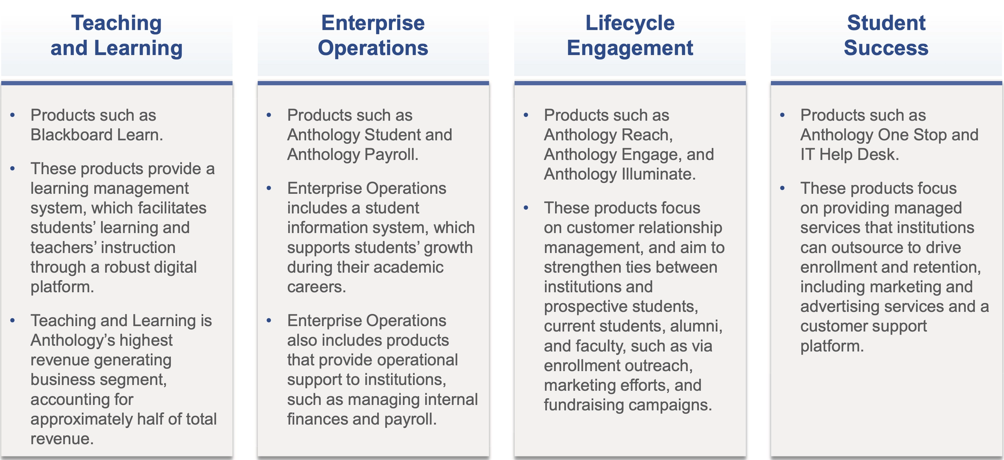 - Its primary products are Blackboard Learn, an LMS that accounts for approximately $240 million in annual revenue (roughly half of the Company’s total), and Anthology Ally, a digital accessibility platform generating approximately $26 million in annual revenue.