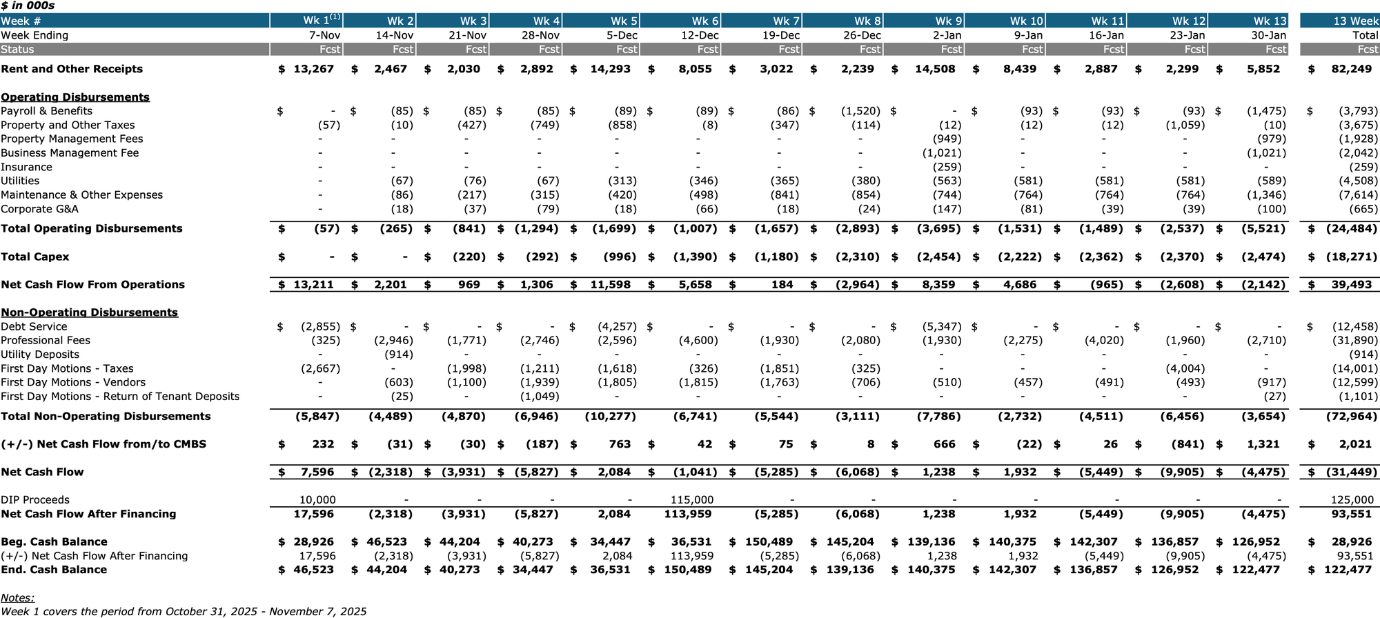 - As of December 31, 2024, the total portfolio was 85.0% leased, down from 86.9% a year prior. By the Chapter 11 filing, portfolio-wide occupancy had fallen to roughly 77.5%, with the debtor-owned properties at 75.7% leased.