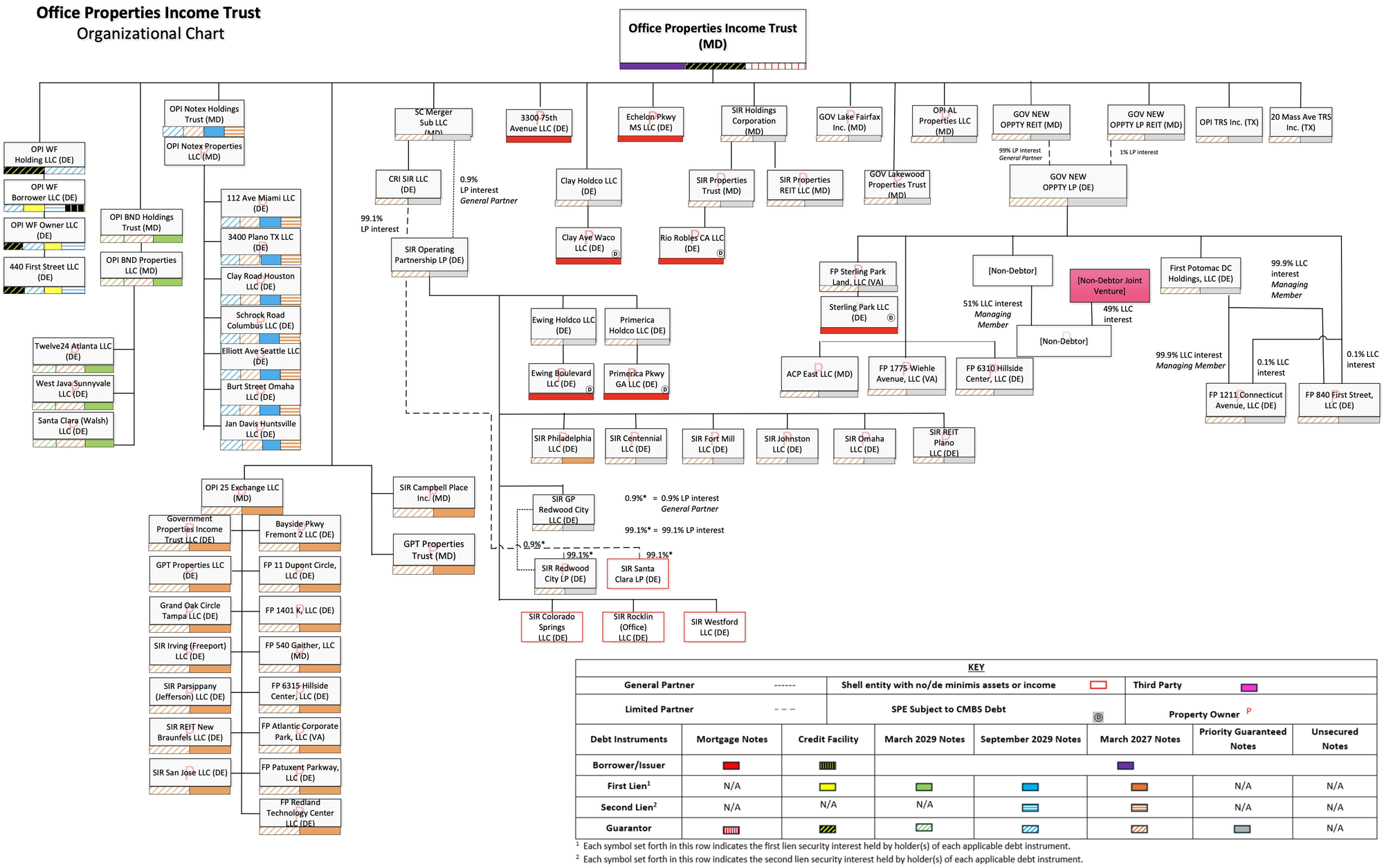- As of the Petition Date, OPI’s capital structure was heavily levered and consisted of a complex mix of secured and unsecured debt, totaling approximately $2.24 billion at the Debtor entities (plus $177 million of non-recourse mortgage debt at non-Debtor joint venture properties).