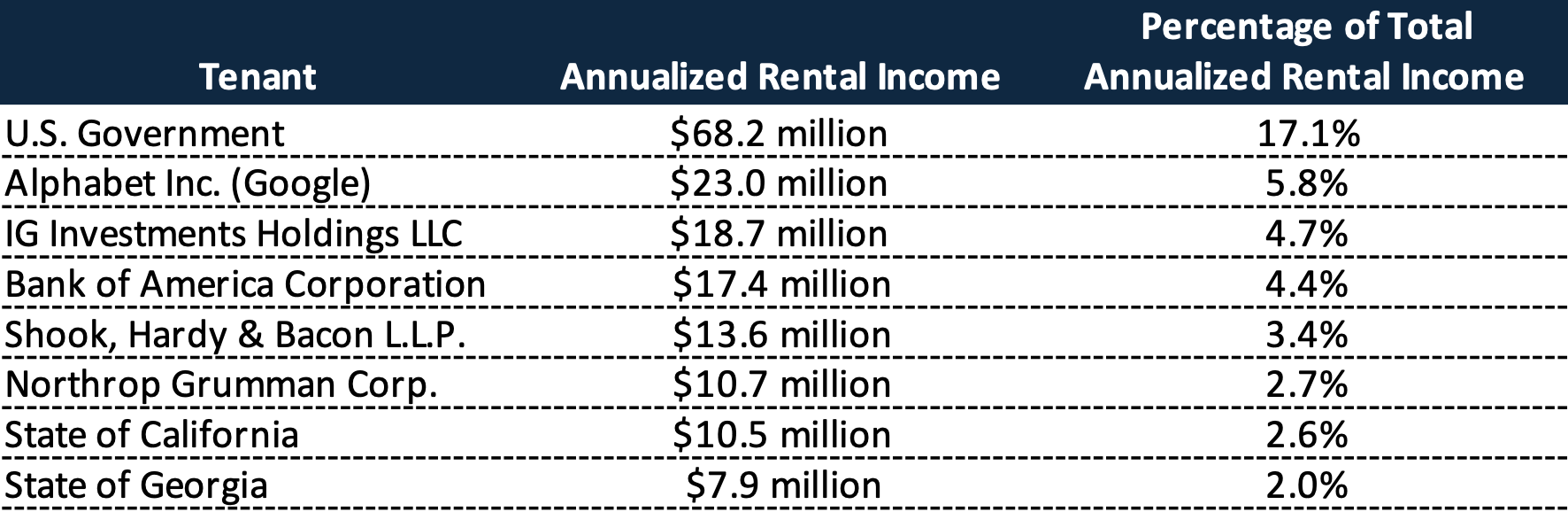 - The U.S. Government represents the Company’s single largest tenant, contributing around 17.1% of annualized rental income as of June 30, 2025.