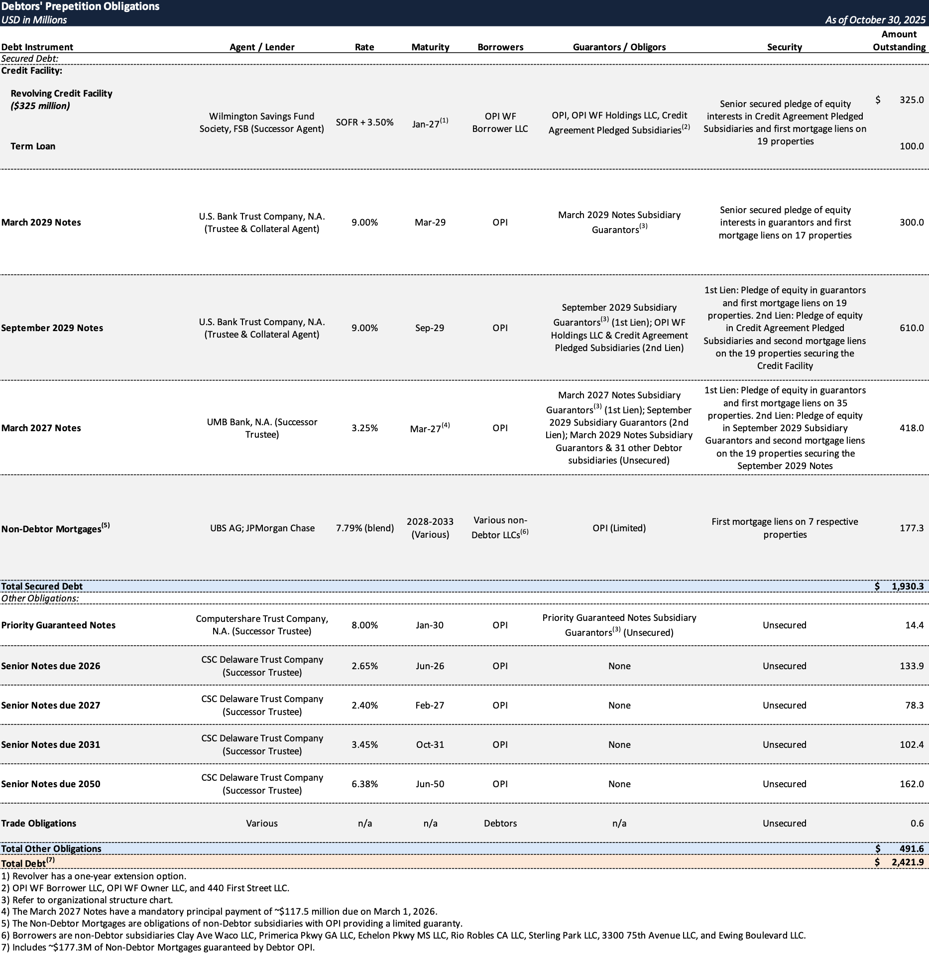 - On October 30, 2025, OPI entered into a Restructuring Support Agreement with holders of approximately 80% of its September 2029 Notes. Key terms include: