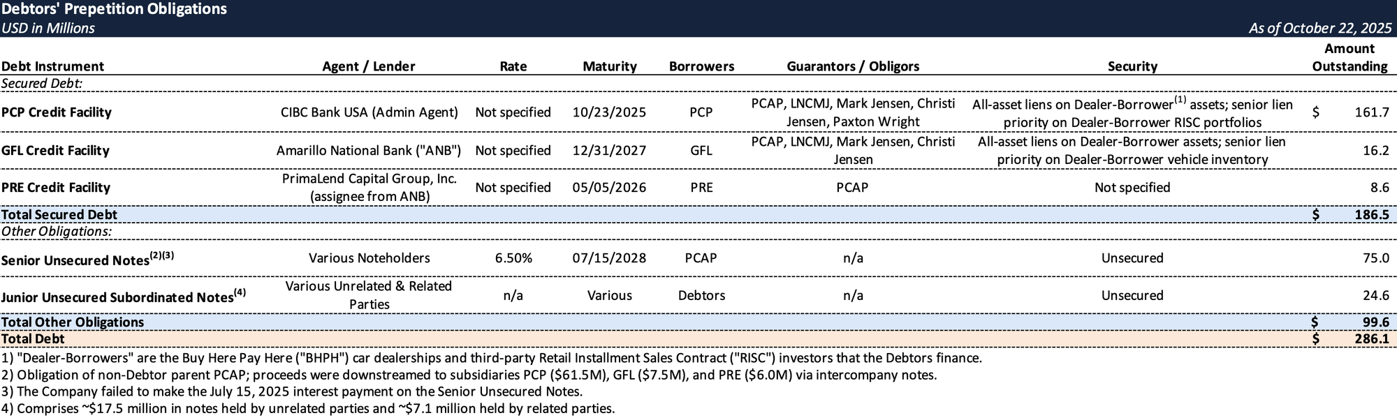- Deleveraging Transactions: In early 2025, PrimaLend implemented stopgap measures, including negotiating paydowns from distressed Dealer-Borrowers. These efforts modestly reduced senior secured exposure but failed to resolve the fundamental liquidity gap.