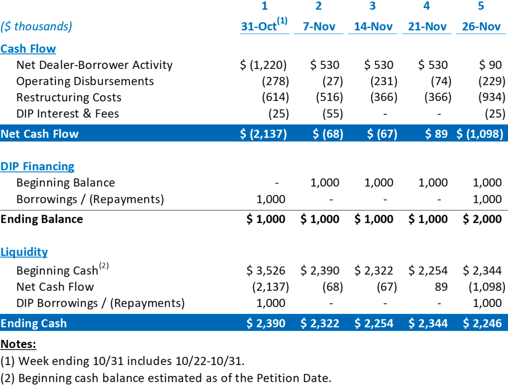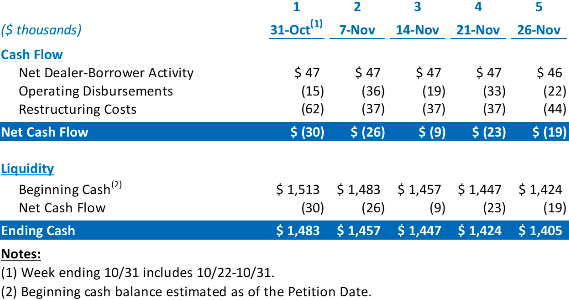 - GFL Cash Collateral: For GFL, no separate DIP loan was obtained. Instead, GFL was authorized to use its cash collateral (generated from loan repayments and inventory sales) to fund ongoing lending to dealers under existing warehouse lines, with ANB receiving adequate protection.