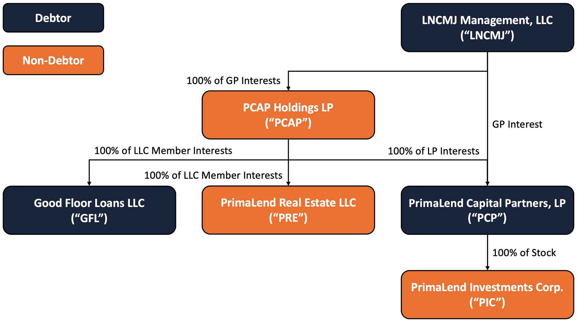 PrimaLend conducts its lending activities through a network of affiliated entities under common management, with shared services coordinated at the PCAP/LNCMJ level. While PCP and GFL are the primary operating lenders, non-Debtor affiliate PRE handles real estate-secured loans.