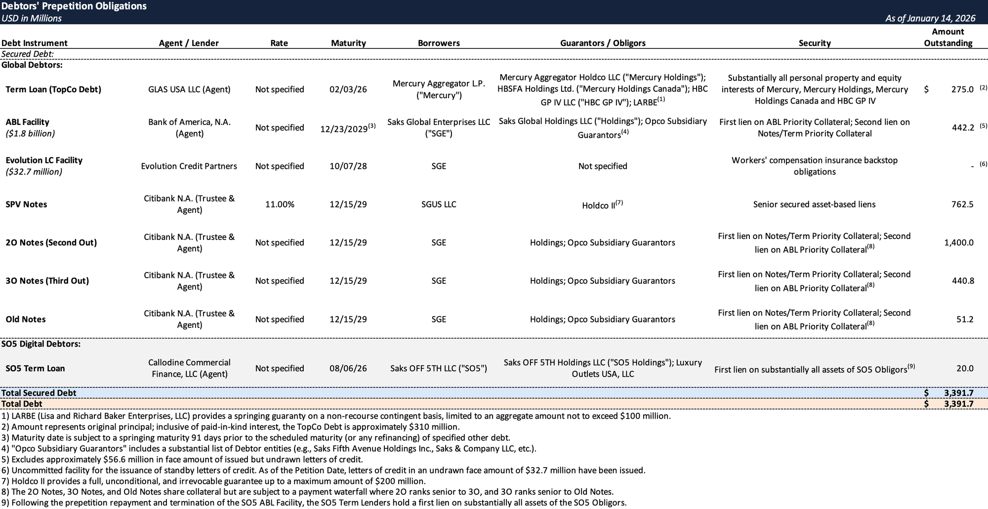 Saks Global Enterprises LLC and certain affiliates (collectively, the "Global Debtors") filed for Chapter 11 protection on January 14, 2026 (the "Petition Date") in the U.S. Bankruptcy Court for the Southern District of Texas, reporting $1 billion to $10 billion in both assets and liabilities. Affiliates operating the Saks OFF 5TH e-commerce business (the "SO5 Digital Debtors," and together with the Global Debtors, the "Debtors") filed concurrently and are seeking joint administration of their cases.